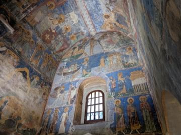Забеленные в позднесредневековое время фрески вновь были открыты во второй половине XIX в. и вскоре записаны клеевой живописью мастерами палехского подрядчика Н.М. Сафонова. В XX в. периодически велись работы по раскрытию древней фресковой живописи и укреплению красочного слоя. Освобожденные от клеевого плена фрески Спасо-Преображенского собора поражают посетителей высочайшим мастерством исполнения, яркостью и насыщенностью тонов, классической иконографией. При росписи использовался минеральный пигмент афганский лазурит — пигмент насыщенного синего цвета, который стоил целое состояние и был сравним с настоящей драгоценностью.
